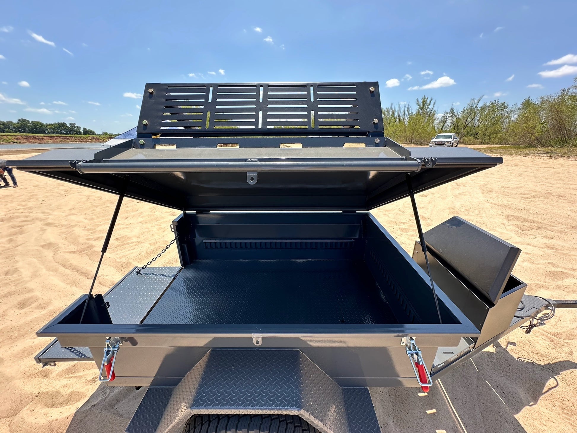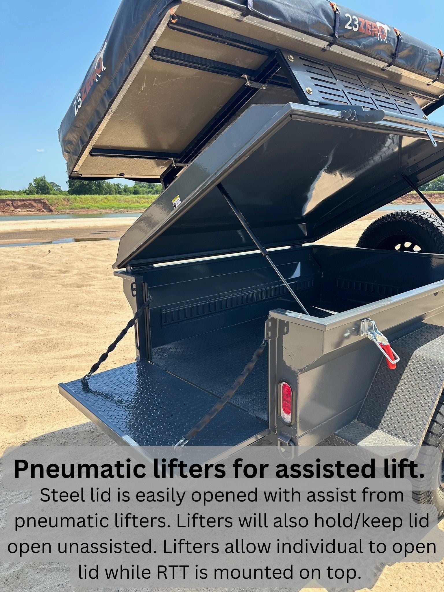 - Lid has electronic actuators for opening and closing. Lid can be opened with a RTT mounted (not while RTT is open) on the lid rack. Actuators are powered by small automotive battery located in toolbox.