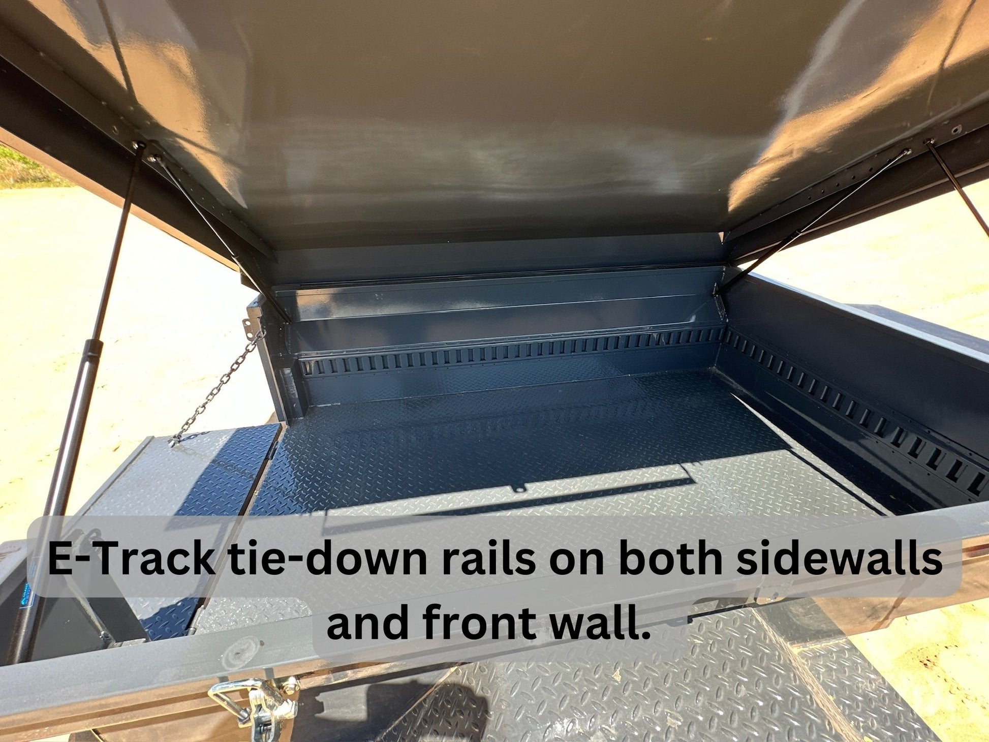 - E-Track tie-down rail system on both interior sides and front interior side of trailer (not on tailgate)