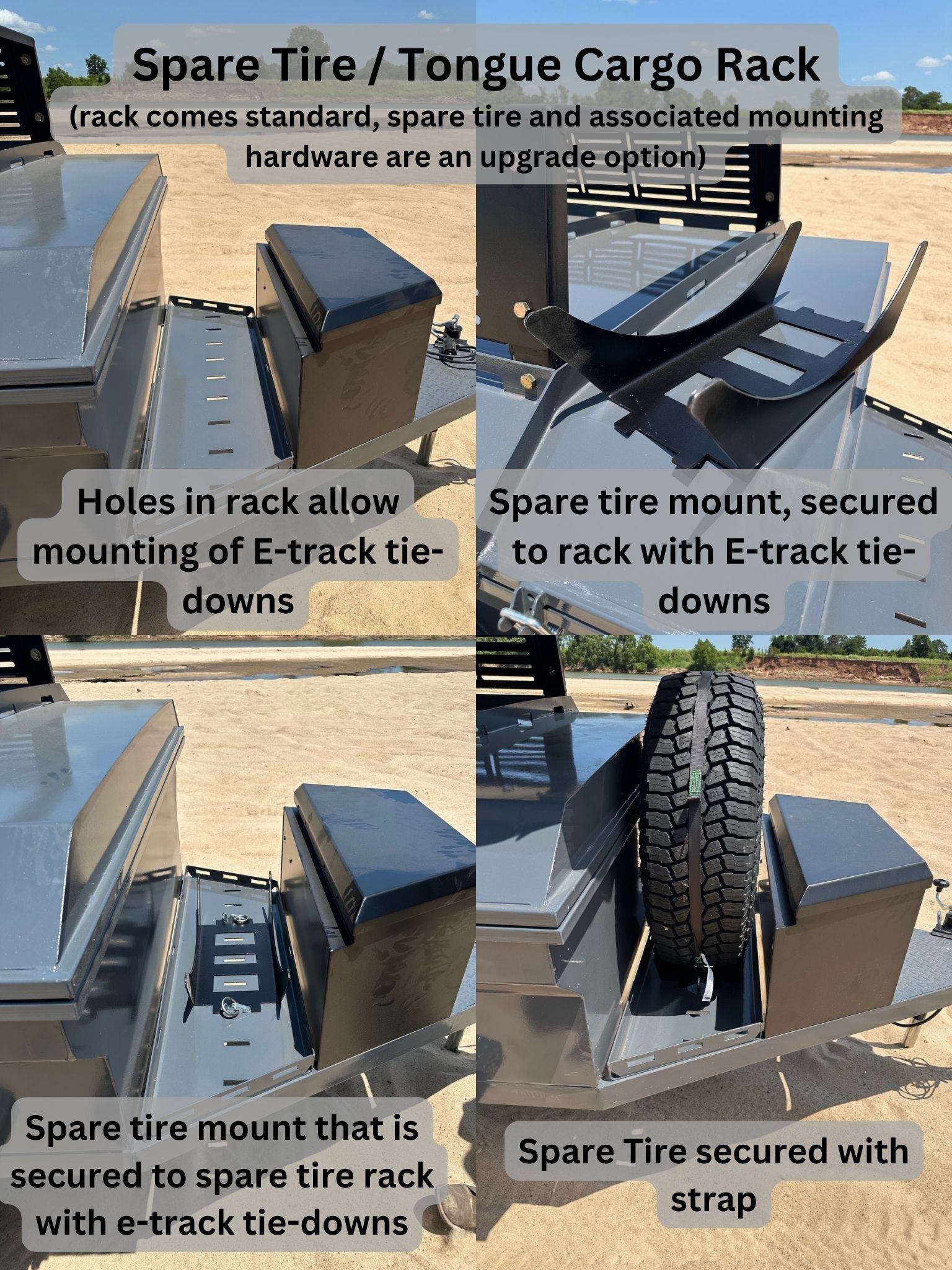 - Spare Tire (or other cargo) Tongue Rack: Mount a spare tire (optional) in our custom-fabricated front-tongue rack. The rack has E-Track mounting holes cut into the bottom surface. E-Track mounting holes can be used for spare-tire mounting, or as a storage area for additional gear.
